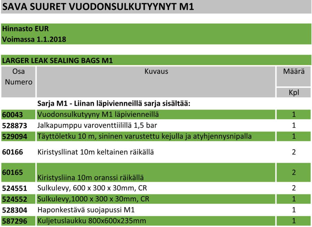 Sava M1 ja M2 vuodonpaikkaussarjat ovat tehokas tapa tukkia suurten varasto- ja kuljetussäiliöiden , tynnyrien sekä halkaisijaltaan yli 500 mm putkien vuotojen tukkimiseen. Vuodonpaikkaustyynyt on valmistettu NR/BR kumista. Tyynyihin on yhdistetty pujotusraot tai teräksiset kiinnityskoukut kiinnityshihnoja varten. M1 ja M2 sarjat sisältävät tarvittavat varusteet. Varusteet voidaan valita myös erillisinä.